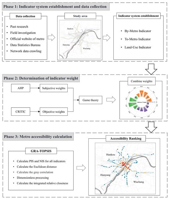 Assessing the accessibility of urban metro stations is essential for optimizing metro system planning and improving travel efficiency for residents. This study proposes an innovative evaluation framework—the CWM-GRA-TOPSIS model—for comprehensive metro station accessibility assessment. First, a multi-dimensional indicator system is established, encompassing three key dimensions, to-metro accessibility, by-metro accessibility, and land use accessibility, which are further refined into 14 secondary indicators for detailed analysis. A Combination Weighting Method (CWM) is then introduced, integrating the Analytic Hierarchy Process (AHP) for subjective weighting and the Criteria Importance Through Intercriteria Correlation (CRITIC) method for objective weighting, with their integration optimized through Game Theory. Subsequently, the overall accessibility of metro stations is evaluated and ranked using a hybrid Grey Relational Analysis (GRA) and Technique for Order Preference by Similarity to Ideal Solution (TOPSIS) approach. The proposed method is applied to Wuhan, China, to demonstrate its effectiveness and applicability. Results show that the CWM-GRA-TOPSIS model, by balancing objectivity and practical relevance, provides a more reliable and systematic approach for identifying accessibility disparities and formulating targeted improvement strategies for urban metro systems.