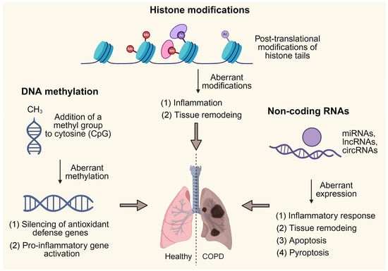 Chronic obstructive pulmonary disease (COPD) remains a major global health burden, characterized by persistent airflow limitation, progressive lung tissue destruction, and systemic comorbidities. Conventional pharmacological therapies alleviate symptoms but have limited efficacy in halting disease progression. Epigenetic mechanisms, including DNA methylation, histone modifications,