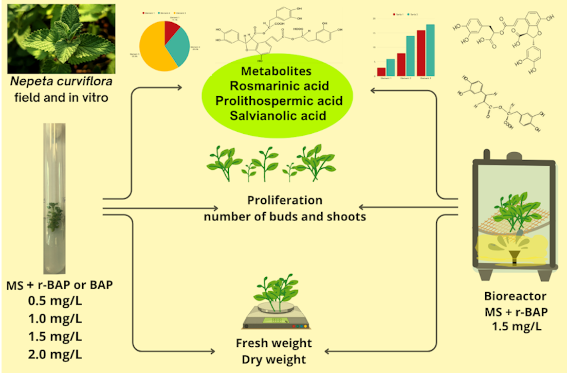 Shoot cultures of Nepeta curviflora were used to test the effect of 6-benzylaminopurine (BAP) and riboside 6-benzylaminopurine (r-BAP) on the growth and production of phenolic compounds. The best multiplication was achieved on agar Murashige and Skoog medium (MS) with r-BAP (1.5 mg/L), where 74% of explants produced about eight axillary shoots. The fresh weight (FW) was about 0.6 g/tube (24 g/L) and the dry weight (DW) was about 0.04 g/tube (2 g/L). To scale up the culture, the shoot culture was grown for the first time in a nutrient sprinkle bioreactor. After 4 weeks of culture, the multiplication rate (8.13) was higher than that observed in glass tubes (8.03). The fresh biomass was 113.2 g/bioreactor (75.5 g/L) and the dry mass was 14 g/bioreactor (9.3 g/L). Extracts from obtained plant material were analyzed by the UPLC/DAD/qTOF-MS technique. A total of 32 phenolic compounds were identified and quantified. The total content of compounds ranged from 600 to 1400 mg/100 g of dry weight (DW), depending on the culture conditions. In the profile of shoot cultures, rosmarinic acid was dominant, whereas prolithospermic acid was mostly noted in extract from aerial parts of the plant obtained from the field.