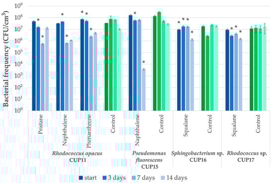Lignite collected from a brown coal deposit was colonized with fully aerobic bacteria exhibiting hydrocarbon biodegradation pathways. Six autochthonous strains were isolated and tested for tolerance and biotransformation potential towards various xenobiotics such as hexadecane, squalane, pristane, benzoic acid, naphthalene, phenanthrene, and diesel oil. After preliminary screening, four xenobiotic-resistant strains were selected (Rhodococcus opacus CUP11, Pseudomonas fluorescens CUP15, Sphingobacterium sp. CUP16, and Rhodococcus sp. CUP17) and further treated for 14 days under aerobic conditions with variant concentrations of each compound (1, 2.5, 5 and 10 g/dm3). Microbial population dynamics and xenobiotic level changes were monitored. Rhodococcus opacus CUP11 and Rhodococcus sp. CUP17 were the most metabolically versatile bacteria capable of biotransforming several xenobiotics. Among the best-performing strains, the highest degradation yields were obtained for CUP17 (81% removal of diesel oil applied at 10 g/dm3, 99% of 2.5 g/dm3 hexadecane and 27% of 1 g/dm3 squalane), and CUP11 (49% of 10 g/dm3 hexadecane and 48% of 1 g/dm3 pristane). The strain CUP16 utilized squalane (33% at 1 g/dm3). The results suggest that the lignite-indigenous bacteria may be applicable for bioremediation of persistent xenobiotics in environmental cleanup projects.