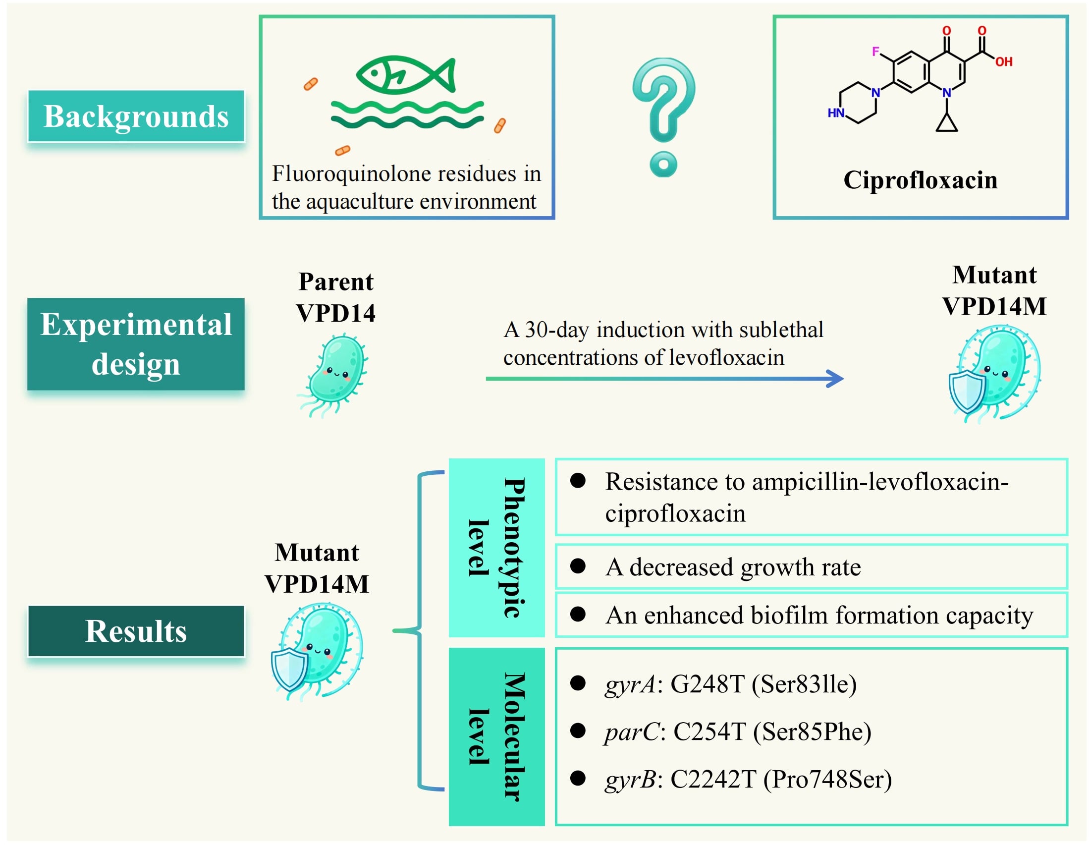 The microevolutionary pathways and molecular mechanisms by which the important pathogen Vibrio parahaemolyticus acquires resistance in the aquatic environment under continuous selective pressure from quinolone antibiotic residues are still unknown. Here, the study successfully simulated the long-term pressure of antibiotic residues in aquaculture
