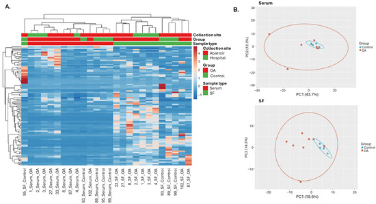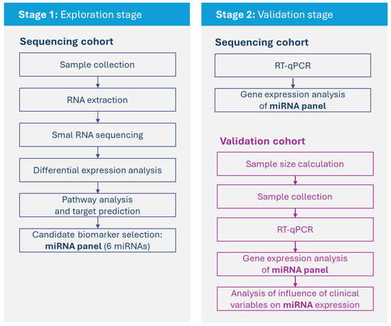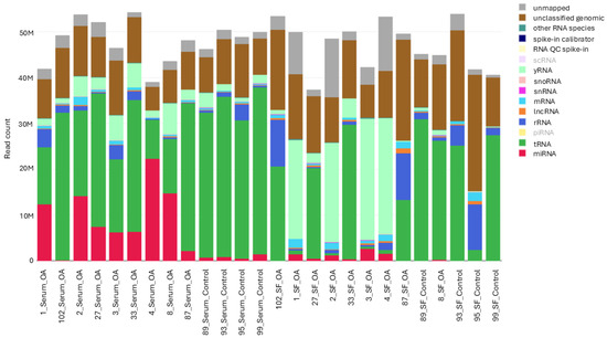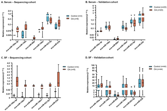 The aim of this study was to identify differentially expressed microRNAs (miRNAs) in serum and synovial fluid (SF) samples of control horses and those with osteoarthritis (OA) to identify potential candidates for biomarkers of disease. Total RNA was extracted from serum and SF samples of control (n = 4) and OA (n = 9) horses and sequenced. Differential expression analysis, pathway analysis and miRNA target prediction were performed. A group of six miRNAs (eca-miR-199a-3p, eca-miR-148a, eca-miR-99b, eca-miR-146a, eca-miR-423-5p and eca-miR-23b) was selected for validation in an independent cohort (serum, n = 46; SF, n = 88). The effect of clinical variables on miRNA expression was also assessed. Sequencing analyses found 43 and 23 differentially expressed miRNAs in serum and SF samples, respectively. Pathway analysis showed miRNAs were involved in inflammatory disease/response and associated with OA pathways. miRNA expression in serum was strongly associated with the horses’ workload, while age had a pronounced influence on miRNA expression in SF. Distinct patterns of miRNA differential expression were observed in serum and SF samples from horses with OA compared to controls. miR-199a-3p and miR-148a warrant further investigation as potential biomarkers of equine OA. Further characterization of these molecular changes could provide novel insights into the mechanisms of early OA. Full article