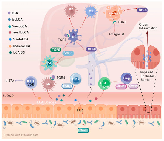 Secondary bile acids are generated from the metabolism of primary bile acids by intestinal flora and play important roles in lipid digestion, regulation of metabolic homeostasis, and intestinal-hepatic axis signaling. Recent studies indicate that lithocholic acid (LCA) and its derivatives (e.g., 3-oxoLCA and isoLCA) are significantly dysregulated in inflammatory bowel disease, nonalcoholic fatty liver disease, and hepatocellular carcinoma. Consequently, LCA species are emerging as promising biomarkers and potential targets for early diagnosis. This review systematically summarizes the metabolic pathways of LCA species, their distribution and concentrations in human blood, urine, and fecal samples, as well as the progress of recent research studies on enterohepatic disorders, which will serve as a reference for the development of new diagnostic and therapeutic methods in the future. Full article