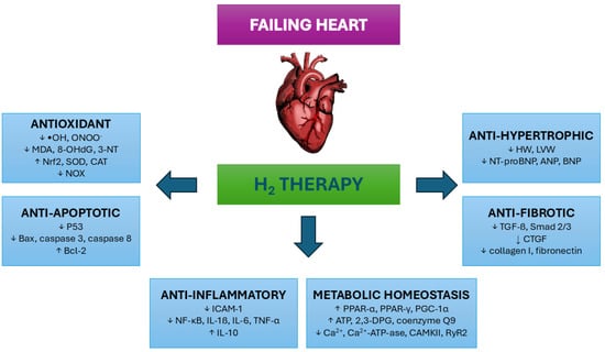 Heart failure (HF) is increasing in prevalence in many countries around the world. HF is a complex clinical syndrome characterized by the heart’s inability to pump blood effectively, resulting in significant morbidity and mortality. After an initial cardiac event (e.g., myocardial infarction, valve dysfunction, hypertension, etc.), adaptive mechanisms are activated to preserve cardiac function. Sustained activation of these mechanisms leads to cellular and structural changes involving cardiac remodeling and hypertrophy. This ultimately leads to impaired cardiac contractility and reduced cardiac output, with a 5-year HF-associated mortality rate up to 75%. The current treatment strategies for HF are not sufficient to cover all the underlying complex mechanisms. It has been demonstrated that molecular hydrogen (H2) exerts cardioprotective effects via its antioxidant, anti-inflammatory, and anti-apoptotic action. The number of studies exploring beneficial effects of H2 in different HF models is increasing. This is the first review summarizing the knowledge in this field. The available literature indicates that H2 may be effective in mitigating different HF pathologies via regulating cardiac oxidative stress and inflammation, cardiomyocyte death, and mitochondrial function/cell metabolism, as well as cardiac remodeling, including hypertrophy and fibrosis. As this area of research is still in its infancy, the feasibility and efficiency of H2 treatment in different HF types need further investigation.