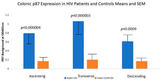 Introduction: Early HIV replication in the gastrointestinal tract plays an important role in HIV pathogenesis. We have followed the onset of the acquired immune deficiency disease (AIDS) pandemic and human immunodeficiency virus (HIV) infection from its recognition in the US. Patients and Methods: We followed 34 adult HIV positive Veterans on cART comparing colon Innate Immune System (InImS) expression of a Paneth cell product (p87; the denominator) and blood ferritin (the numerator) to derive the FERAD ratio, and p87 expression by immunohistochemistry available in some of our HIV patients and compare the expression to 2252 without HIV. Stool and colonoscopically obtained tissue specimens were run in a p87 ELISA and immunohistochemistry for both fixed and native antigens, using the Adnab-9 antibody. Results: There were no significant differences in demographics aside from lower BMI in HIV patients (24.93 ± 6.30 vs. 28.0 ± 6.13 kg/m2) p < 0.0001. Native p87 antigen was elevated in HIV patients compared to controls in the ascending, transverse, and descending colon (0.794 ± 0.890 vs. 0.170 ± 0.201 respectively; p < 0.000004; 1.062 ± 0.730 vs. 0.202 ± 0.377 respectively; p < 0.000003; and 0.611 ± 0.182 vs. 0.174 ± 0.251 respectively; p < 0.0009), respectively; and Helicobacter pylori (H. pylori) detection was higher in HIV patients (84.6% vs. 36%; p < 0.0002). We also ran these assays in cancer patients for comparison. Conclusions: Colonic inflammation as expressed by p87, a Paneth cell product, is significantly elevated in HIV patients and likely represents continued HIV activity leading to inflammation.