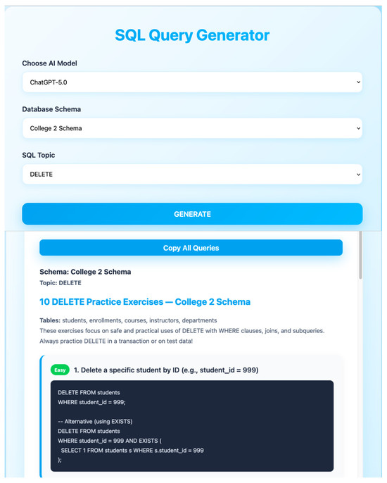 Today, relational databases are widely used in information systems. SQL (structured query language) is taught extensively in universities and professional schools across the globe as a programming language for its data management and accesses. Previously, we have studied a web-based programming learning assistant system (PLAS) to help novice students learn popular programming languages by themselves through solving various types of exercises. For SQL programming, we have implemented the grammar-concept understanding problem (GUP) and the comment insertion problem (CIP) for its initial studies. In this paper, we propose an SQL Query Description Problem (SDP) as a new exercise type for describing the SQL query to a specified request in a MySQL database system. To reduce teachers’ preparation workloads, we integrate a generative AI-assisted SQL query generator to automatically generate a new SDP instance with a given dataset. An SDP instance consists of a table, a set of questions and corresponding queries. Answer correctness is determined by enhanced string matching against an answer module that includes multiple semantically equivalent canonical queries. For evaluation, we generated 11 SDP instances on basic topics using the generator, where we found that Gemini 3.0 Pro exhibited higher pedagogical consistency compared to ChatGPT-5.0, achieving perfect scores in Sensibleness, Topicality, and Readiness metrics. Then, we assigned the generated instances to 32 undergraduate students at the Indonesian Institute of Business and Technology (INSTIKI). The results showed an average correct answer rate of 95.2% and a mean SUS score of 78, which demonstrates strong initial student performance and system acceptance.