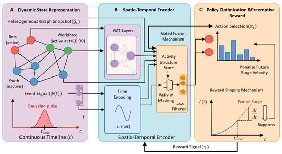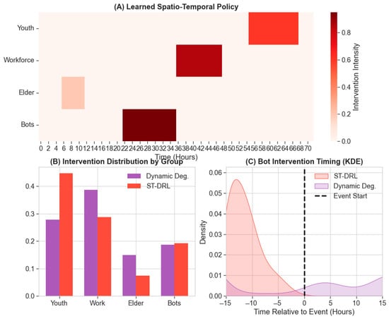 The containment of misinformation diffusion on social media is a critical challenge in computational social science. However, prevailing intervention strategies predominantly rely on static topological metrics or time-agnostic learning models, thereby overlooking the profound impact of temporal–demographic heterogeneity. This oversight frequently results in a “spatio-temporal mismatch”, where limited intervention resources are misallocated to structurally central but temporarily inactive nodes, particularly during non-stationary propagation bursts driven by exogenous triggers. To bridge this gap, we propose a Spatio-Temporal Deep Reinforcement Learning (ST-DRL) framework for proactive misinformation defense. By seamlessly integrating continuous trigonometric time encoding with demographic-aware Graph Attention Networks, our model explicitly captures the coupling dynamics between group-specific circadian rhythms and event-driven transmission surges. Extensive simulations on heterogeneous networks demonstrate that ST-DRL achieves a Peak Prevalence Reduction of 93.2%, significantly outperforming static heuristics and approaching the theoretical upper bound of oracle-assisted baselines. Crucially, interpretability analysis reveals that the agent autonomously evolves a “Preemptive Strike” strategy—prioritizing the sanitization of high-risk bridge nodes, such as bots, prior to event onsets—thus establishing a new paradigm for predictive rather than reactive network governance.