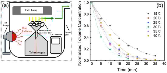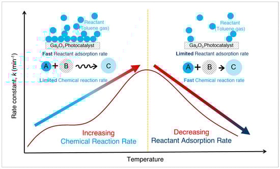Volatile organic compounds (VOCs), including benzene, toluene, and formaldehyde, are hazardous air pollutants that require efficient and sustainable mitigation strategies. Photocatalytic degradation of VOCs offers a promising pathway; however, its performance is strongly influenced by multiple operational parameters. Here, we present a systematic investigation of toluene degradation under ultraviolet-C (UVC) irradiation across controlled temperatures using Ga2O3 as a photocatalyst. A comprehensive analysis revealed that elevated temperatures enhanced photocatalytic activity by accelerating chemical reaction rates. However, further temperature increases led to a decrease in performance due to a reduction in the reactant adsorption rate. An optimal operating temperature was identified, at which the balance between chemical reaction rates and reactant adsorption yields the highest degradation efficiency. These findings demonstrate Ga2O3 as a promising photocatalyst and provide fundamental insights into the temperature-dependent photocatalytic mechanisms governing VOC removal in practical environmental applications.