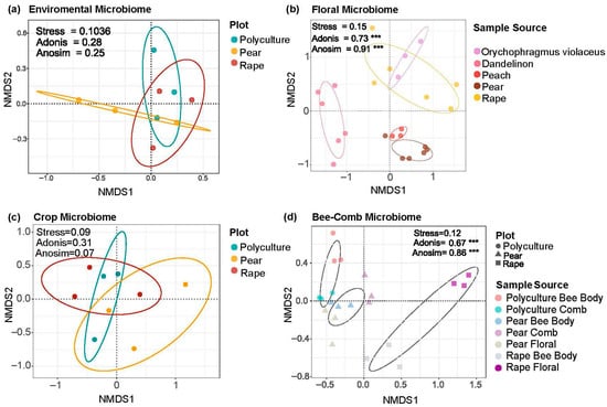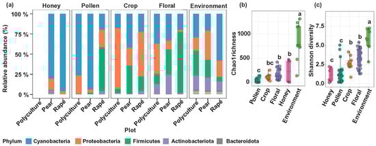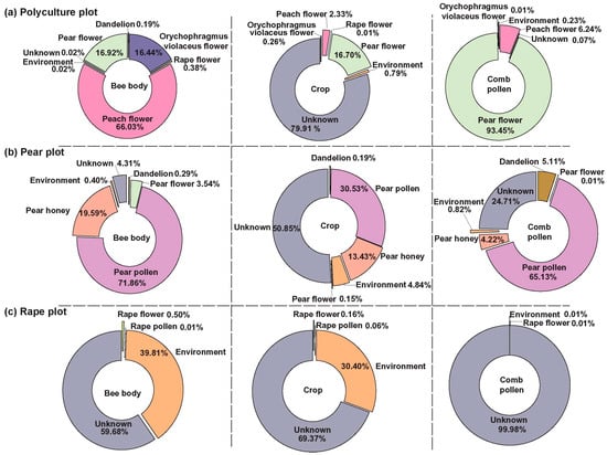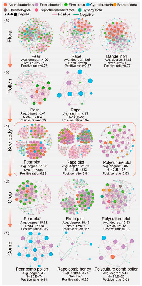 Honey bees, as vital pollinators and essential contributors to terrestrial ecosystems, play a critical role in maintaining biodiversity and ecological stability. Beyond their role as pollinators, honey bees are increasingly recognized as bioindicators of environmental health, with their microbiomes reflecting habitat quality, agricultural practices, and broader ecological conditions. This study examines the impact of monoculture and polyculture systems on bee-associated microbiomes, focusing on microbial diversity, composition, and functional roles. Microbial communities from floral surfaces, pollen, nectar, foraging bees, hive matrices, and bioaerosols were analyzed across three agricultural plots: a rape monoculture, a pear monoculture, and a polyculture plot. Using 16S rRNA amplicon sequencing, network co-occurrence analysis, and microbial source tracking, the findings reveal that plant species and cultivation methods significantly shape microbial dynamics (Adonis = 0.67 ***). Floral microbiomes exhibit host specificity (Adonis = 0.73 ***), while the honey bee body surface functions as a microbial hub linking environmental, floral, and hive microbial networks (average degree pear: 21.86; rape: 21.96). The polyculture system improves microbial diversity due to the diversity of nectar plants, enhancing ecosystem connectivity and potentially benefiting honey bee health. These results highlight the ecological importance of optimizing agricultural practices to preserve microbial diversity, enhance honey bee health, and maintain ecological stability.