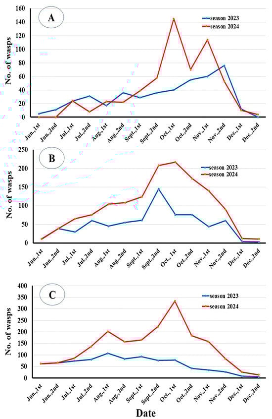 This study investigated the population dynamics of Vespa orientalis L. (Hymenoptera: Vespidae) across two consecutive seasons (2023–2024) in selected apiaries, with a focus on nest composition (eggs, larvae, and pupae) and the effectiveness of various bait traps for capturing the species. Monthly monitoring