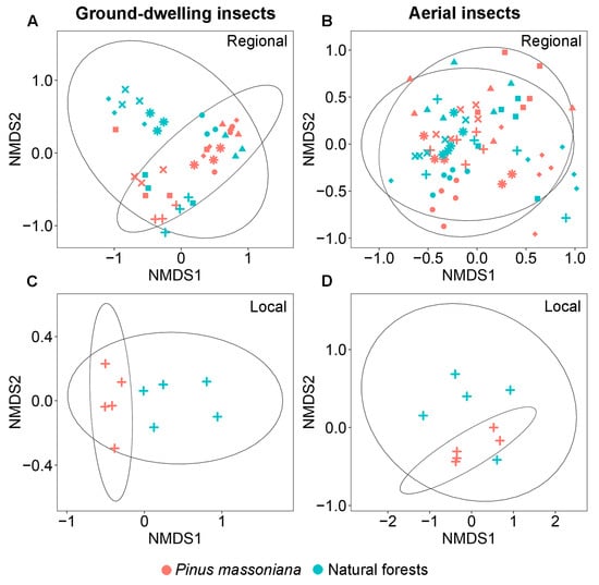 Masson pine (Pinus massoniana Lamb.) is the most widely planted tree species in southern China, playing a critical role in forestry production and reforestation. Understanding the contribution of Masson pine plantations to biodiversity conservation is essential for sustainable land-use policies. We conducted comparative studies to examine the family diversity and composition of ground-dwelling and aerial insects in Masson pine plantations and adjacent natural forests at regional (spanning five forest types across Guangxi, China) and local (at Yachang, Guangxi) scales. We investigated the mechanisms driving the differences in insect community assemblages between the two forest types at the local scale. Our results indicated that aerial insect diversity and composition in Masson pine plantations were comparable to those in natural forests. However, ground-dwelling insects in plantations showed a significant decline in diversity and a notable shift in community composition, with a decrease in highly mobile omnivores (e.g., Drosophilidae and Nitidulidae) and an increase in crawling detritivores (e.g., Blattidae and Gryllidae). These patterns were consistent at both regional and local scales. At the local scale, the shift in ground-dwelling insect community composition was linked to decreased understory tree density (explaining 45.9% of the compositional variation), reduced litter Ca content (29.7%), and increased litter cover (13.5%) in plantations. To enhance ground-dwelling insect diversity in Masson pine plantations, mixed planting with broad-leaved species offers an effective management strategy. This approach both enriches litter nutrients and reduces needle litter accumulation, thereby supporting the recovery of understory vegetation.