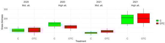 Understanding how rising temperatures driven by climate change affect biodiversity and ecosystem functioning is particularly relevant in fragile island environments. Terceira Island, part of the Azorean Archipelago (Portugal) in the mid-Atlantic Ocean, was selected for an in situ experiment to assess the effects of simulated warming on arthropod diversity and grass productivity in intensively managed pastures. Over one year, we examined the influence of a simulated increase in temperature via Open Top Chambers (OTCs) on ground-dwelling arthropod assemblages and plant biomass. We used several statistical methods to analyze both individual variables and overall community patterns to explore the relationships between treatments, grass biomass, and arthropod community structure. Although the OTC treatment did not result in any significant changes to the analyzed variables, an increase in diversity indices was observed over the course of the experiment. Distance-based redundancy analysis revealed significant effects of both OTC treatment and altitude on arthropod community composition. Models showed that the analyzed variables only partially explained the observed changes. Nevertheless, additional factors, such as vegetation structure and microclimatic variation, may also contribute to the observed patterns and warrant further investigation. These results underscore the importance of long-term, multifactorial approaches to understanding interactions between warming, plant productivity, and arthropod diversity.