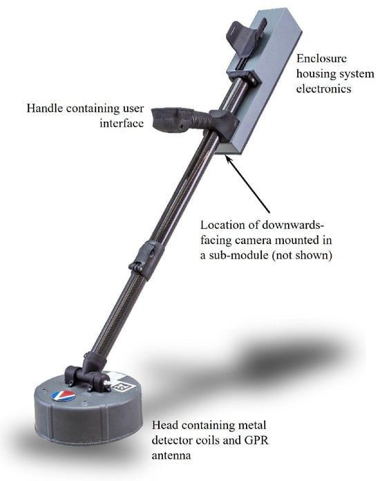 A positioning system employing visual fiducial markers (AprilTags) has been implemented for use with handheld mine detection equipment. To be suitable for a battery-powered real-time application, the system has been designed to operate at low power (<100 mW) and frame rates between 30 and 50 fps. The system has been integrated into an experimental dual-mode detector system. Position-indexed metal detector and ground-penetrating radar data from laboratory and field trials are presented. The accuracy and precision of the vision-based system are found to be 1.2 cm and 0.5 cm, respectively.