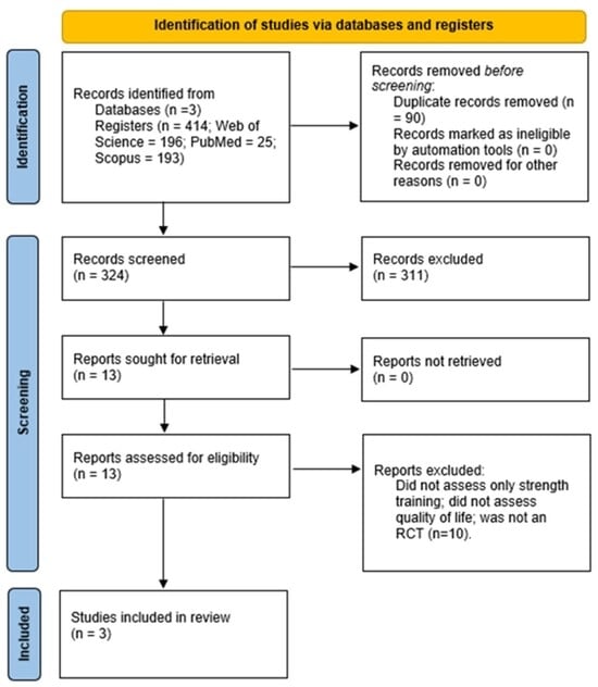 Objective: The objective of this systematic review is to analyze the effects of strength training on the quality of life (QoL) of older adults diagnosed with sarcopenia, contributing to a better understanding of the impact of this intervention on the physical and psychological well-being of this population. Methods: A systematic review was conducted following the PRISMA guidelines. The search was conducted on the Web of Science, Scopus, and PubMed databases, including studies published until 2025. Randomized controlled trials that applied strength training interventions in individuals aged 60 years or older with sarcopenia were included, evaluating QoL as the primary outcome. Data screening, extraction, and analysis were performed by two independent investigators. Results: Three studies from the United Kingdom, Saudi Arabia, and China were included, with interventions ranging from 6 to 16 weeks. The results showed that strength training can improve the quality of life of older adults with sarcopenia (instruments: SarQoL, SF-36, WHOQOL-BREF), being more effective in high-intensity and supervised interventions. One of the studies revealed significant improvements (p < 0.001), while the others showed non-significant increases. Conclusions: Strength training proved to be a promising intervention for promoting improvements in the quality of life of older adults with sarcopenia, especially when performed at adequate intensity and with regular monitoring. However, further studies with larger samples, long-term follow-up, and standardization of QoL assessment tools are needed.