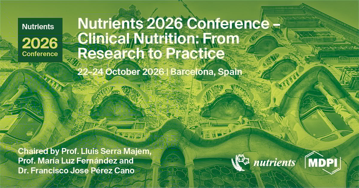 We cordially invite you to attend this event organized by MDPI’s Nutrients (ISSN: 2072-6643, impact factor: 5.0, CiteScore: 9.1). It will take place on 22–24 October 2026, CEST, in Barcelona, Spain.