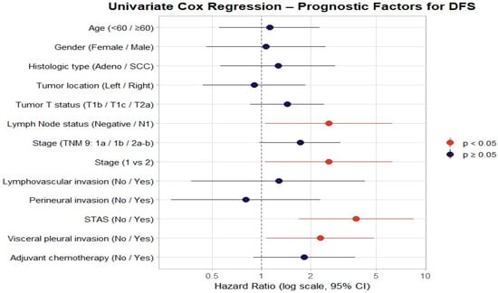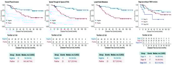 Background/Objectives: This study aimed to evaluate the prognostic effects of tumor spread through air spaces (STAS) and other clinical and pathological risk factors on disease-free survival (DFS) in patients with non-small cell lung cancer (NSCLC) who underwent curative lobectomy and had tumors measuring