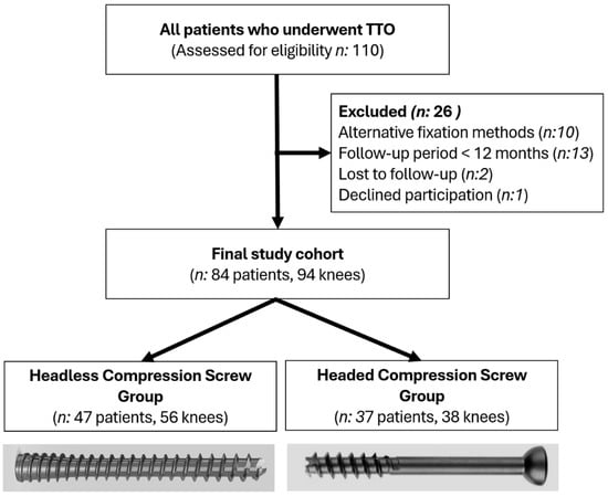 Background/Objectives: Symptomatic hardware removal remains the most frequent cause of reoperation after tibial tubercle osteotomy (TTO), with removal rates reported as high as 49%. Headless compression screws have been proposed as a low-profile alternative to conventional screws to reduce hardware-related morbidity, yet