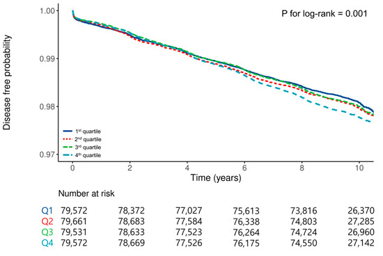 Background/Objectives: Insulin resistance (IR) is increasingly recognized as a factor associated with metabolic syndrome and various cancers. The metabolic score for insulin resistance (METS-IR) has emerged as a reliable surrogate marker for assessing IR. This study evaluated the association between the METS-IR and the gastric cancer (GC) incidence using data from a nationwide South Korean cohort. Methods: Data were obtained from the National Health Insurance Service (NHIS) cohort. A total of 318,336 participants aged ≥40 years who underwent a nationwide health screening between 2009 and 2010 were included and followed until GC diagnosis, death, or 31 December 2019. The METS-IR was calculated and categorized into quartiles. Hazard ratios (HRs) for GC incidence were estimated using Cox proportional hazards models. The analyses were adjusted for confounders, including age, sex, socioeconomic status, lifestyle factors, and comorbidities. Results: Participants in the highest METS-IR quartile (Q4) exhibited a significantly higher crude incidence of GC (2.26 per 1000 person-years) than those in the lowest quartile (Q1: 1.97 per 1000 person-years). Adjusted HRs showed a modest but statistically significant increase in GC risk in Q4 (HR: 1.10; 95% confidence interval: 1.02–1.19; p = 0.01) compared to Q1. Kaplan–Meier analysis revealed that participants with higher METS-IR levels had significantly shorter GC-free survival times than those in the lower quartiles. Restricted cubic spline analysis revealed a nonlinear relationship between the METS-IR and GC risk, with higher METS-IR levels associated with an increased risk. Conclusions: An elevated METS-IR was associated with an increased GC risk, suggesting its potential utility in stratifying GC risk. The METS-IR may help identify high-risk individuals and support GC prevention.