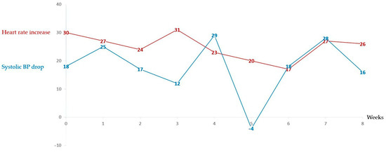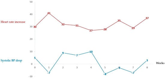 Background/Objectives: Myalgic Encephalomyelitis/Chronic Fatigue Syndrome (ME/CFS) and Long COVID (LC) are complex multisystem conditions with significant functional disability. Many patients experience symptoms of orthostatic intolerance, which can be captured in some cases as Orthostatic Hypotension (OH) or Postural orthostatic Tachycardia Syndrome (PoTS) on objective testing. Conservative treatments are recommended for first-line symptom management, but there is a lack of efficacy evidence. This study aims to assess the feasibility of an 8-week clinically supervised, personalised Dysautonomia Management Protocol (DMP) in a cohort of ME/CFS and LC patients with subjective and objective evidence of orthostatic intolerance (dysautonomia). Methods: ME/CFS and LC patients with objective dysautonomia on the 10 min active Lean Test (LT) were recruited to an 8-week DMP, with interventions introduced cumulatively every two weeks. Interventions included increasing daily fluid intake to 3 litres and salt intake to 10 g, pacing to avoid crashes and calf activation. Baseline and weekly data collection included the LT, Composite Autonomic Symptom Score questionnaire (COMPASS-31) and Yorkshire Rehabilitation Scale (YRS). Results: Sixteen participants completed the 8-week program, five discontinued during the program, and one was withdrawn following a severe crash. The COMPASS-31 improved by 7.7 points from week 1 to week 8 (p = 0.045), with a medium Cohen’s d effect size of 0.55. For the same period, there was a non-significant (p = 0.16) improvement in the YRS symptom severity score by 2 points. Comparing the final two weeks of the program with the first two weeks, mean heart rate during the LT decreased by 4.8 beats per minute (p = 0.032), with a medium Cohen’s d effect size of 0.44. Adherence to the interventions was highly variable, with none of the patients able to fully employ all four recommendations. Conclusions: The results suggest that targeted conservative interventions could influence autonomic function and symptom reduction. However, the magnitude of change was limited, and statistical significance might not necessarily relate to a clinically significant improvement in symptoms.