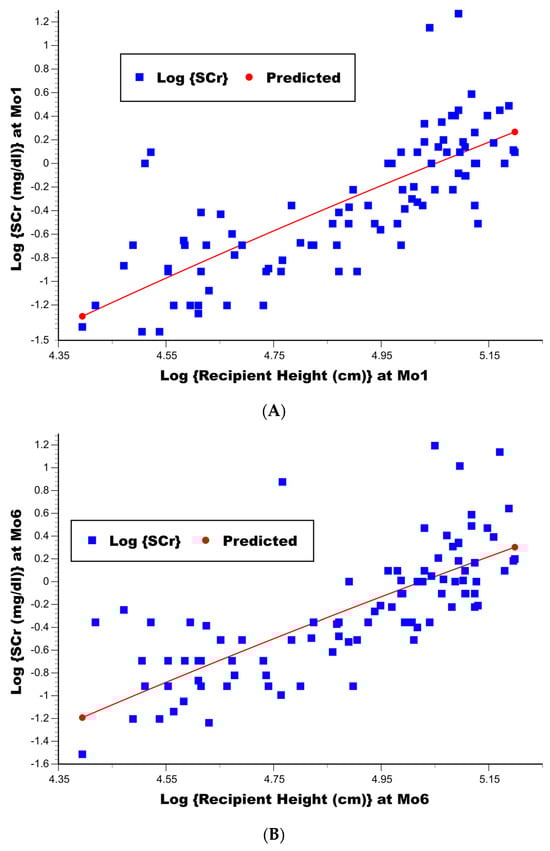 Background: The updated Schwartz and CKiDU25 bedside (SCr-based) formulae for the estimated glomerular filtration rate (eGFR) in children are defined by a constant term (with the latter formula dependent upon age and sex) multiplied by the ratio of patient’s height (m) to SCr (mg/dL). However, the Schwartz formula can severely underestimate the measured GFR (mGFR) at higher mGFR levels. Methods: For a single-center cohort of 92 pediatric kidney transplant recipients, we statistically determined if the log{eGFR} at 1 mo and 6 mo post-transplant might further depend upon patient demographics or height, indicating the inadequacy of these formulae for properly predicting the mGFR. We also determined how the log{SCr} at 1 mo and 6 mo post-transplant might depend upon patient demographics and height, helping to corroborate any arrived-at improved functional form for the eGFR. Results: Overall, our cohort received good-quality donor kidneys; however, both eGFR formulae calculated that the percentage of recipients with an eGFR < 60 mL/min/1.73 m2 at 1 mo and 6 mo post-transplant was 26–28%. Furthermore, neither the updated Schwartz nor the CKiDU25 bedside formulae adequately controlled for the influence of patient height on SCr; in fact, the patient height squared was superior to its unidimensional value at accounting for the sharp increase in SCr that normally occurs as children grow from infancy to young adulthood (p < 0.000001 at mo1, p = 0.000003 at mo6 for the updated Schwartz bedside formula; p = 0.0009 at mo1, p = 0.005 at mo6 for the CKiDU25 bedside formula). The log{SCr} was also best fitted by a linear regression model that controlled for the log{patient height squared} (p < 0.000001 at both mo1 and mo6). Conclusions: A statistically more accurate eGFR formula should be based on using a power function (power > 1) for patient height rather than its unidimensional value.