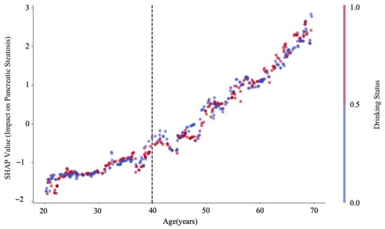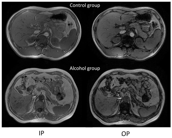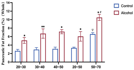 Background: Chronic alcohol consumption is a recognized cause of pancreatic steatosis, though its imaging characteristics in individuals remain undefined. This study investigated the effect of chronic alcohol intake on the pancreatic fat content and distribution in a male population and assessed the impact of abstinence. Methods: In this cross-sectional study, 140 male alcohol drinkers (who consumed >20 g ethanol/day for >5 years) and 142 male non-drinkers were recruited. The pancreatic fat fraction (FF) was quantified using T1- and T2*-corrected double-echo chemical shift magnetic resonance imaging (CSI). Participants were stratified by age (20–50 years, 50–70 years). Drinkers were further categorized as current drinkers or short-term (<1 year) or long-term (1–2 years) abstainers. Results: The pancreatic FF was significantly higher in alcohol drinkers compared with age-matched controls in the 20–50-year-old (6.07 ± 1.59% vs. 2.94 ± 0.62%, p < 0.05) and 50–70-year-old (9.14 ± 2.22% vs. 5.98 ± 1.00%, p < 0.05) groups. In drinkers aged 40–70 years, the pancreatic fat distribution was uneven. No significant difference in the FF was observed across the three drinking status groups (p > 0.05). Conclusions: Chronic alcohol consumption could cause fat deposition in the pancreas. An uneven distribution of pancreatic fat began in the fourth decade in this male population. An alcoholic fatty pancreas was not reversed within a follow-up period of up to two years.