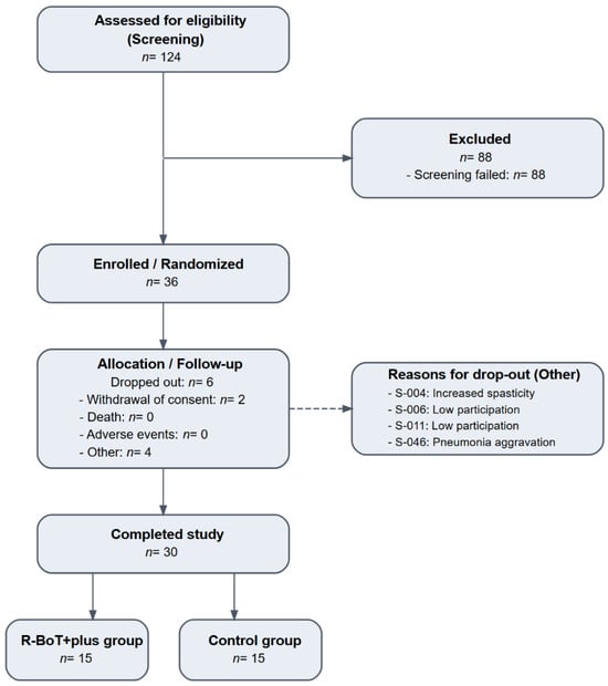 Background/Objectives: Abnormal muscle tone and impaired motor control commonly limit gait recovery after stroke. Robot-assisted gait training has been introduced to augment conventional rehabilitation; however, its effects on stage-based motor recovery, functional ambulation, and muscle tone during the subacute phase remain unclear. Methods: This prospective, single-center, randomized controlled trial enrolled 30 patients with subacute stroke who received robot-assisted gait training plus conventional rehabilitation (R-BoT Plus group, n = 15) or conventional rehabilitation alone (control group, n = 15) over 4 weeks. The primary outcome was the change in Brunnstrom recovery stage of the lower extremities (BRS-LE). Secondary outcomes included Functional Ambulation Category (FAC), Fugl–Meyer Assessment for the Lower Extremity (FMA-LE), clinical spasticity measures (Modified Ashworth Scale and Modified Tardieu Scale), and muscle mechanical properties (MyotonPRO). Exploratory analyses were conducted to examine the associations between changes in stage-based motor recovery (ΔBRS-LE), functional ambulation (ΔFAC), and MyotonPRO parameters. Within-group changes were assessed using the Wilcoxon signed-rank test. Between-group effects were primarily evaluated using baseline-adjusted ANCOVA with HC3 robust standard errors, with Wilcoxon rank-sum tests on change scores as sensitivity analyses. Associations between changes in clinical outcomes and MyotonPRO parameters were evaluated using Spearman’s rank correlation coefficient (ρ). Results: BRS-LE (p = 0.014) and functional ambulation (p = 0.041) were significantly improved in the R-BoT Plus group. Changes in FMA-LE and clinical spasticity measures did not differ significantly between groups. Quantitative myotonometry revealed selective muscle- and parameter-specific changes. No robust correlations were observed between MyotonPRO parameters and changes in BRS-LE. Conclusions: The addition of robot-assisted gait training to conventional rehabilitation was associated with greater improvements in stage-based lower-limb motor recovery and functional ambulation in patients with subacute stroke. In contrast, cumulative impairment scores and conventional clinical spasticity measures demonstrated limited changes between groups. Quantitative muscle mechanical assessment revealed selective muscle-specific adaptations, supporting its role as a complementary tool for mechanistic characterization rather than as a surrogate marker of motor recovery. Future studies incorporating dose-matched designs and longer follow-up periods are warranted to clarify the independent and long-term effects of robot-assisted gait training.
