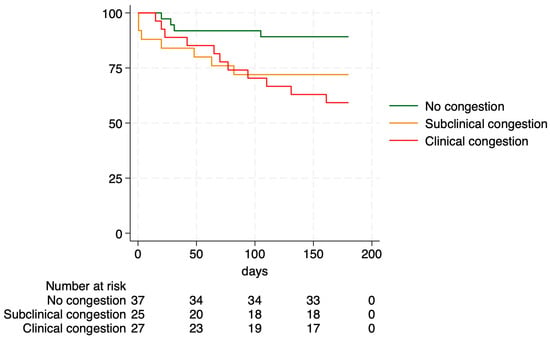 Background/Objectives: Congestion is a hallmark of heart failure (HF) and a major determinant of outcomes. Non-invasive tools enable detection of subclinical congestion, but their correlation and prognostic relevance remain incompletely defined. The present study aimed to assess the prevalence, evolution, interrelationships, and prognostic impact of clinical and subclinical congestion markers in patients hospitalized for HF. Methods: This single-centre, prospective cohort study included adults admitted with HF who underwent serial evaluations at admission, 72 h, pre-discharge, early outpatient follow-up and at 6 months. Clinical congestion was assessed using a standardized physical examination score. Subclinical congestion was evaluated using lung ultrasound (LUS), Venous Excess Ultrasound Score (VExUS), and Remote Dielectric Sensing (ReDS). Patients were classified according to the presence of clinical and/or subclinical congestion at discharge. The primary endpoint was a composite of all-cause mortality, HF readmission, or unscheduled visits requiring intravenous diuretics within six months. Results: Ninety-four patients (mean age 74 ± 11 years, 68% male) were included. While clinical congestion improved significantly during hospitalization, approximately 30% of patients remained clinically congested at discharge. Among clinically euvolemic patients, only 47% showed no evidence of subclinical congestion. Correlations between congestion markers were weak to moderate, suggesting complementary pathophysiological information. At discharge, pulmonary B-lines were the strongest predictor of the composite endpoint (hazard ratio [HR] 3.50, 95% CI 1.41–8.72), followed by clinical congestion (HR 2.67, 95% CI 1.13–6.30). Patients with clinical and subclinical congestion exhibited lower event-free survival. Conclusions: Subclinical congestion is common despite apparent clinical euvolemia and is associated with worse outcomes. Integrating clinical assessment with non-invasive congestion markers may improve post-discharge risk stratification in HF.