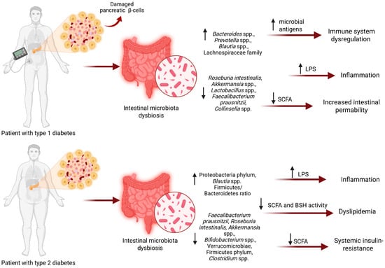 Emerging evidence strongly suggests that gut microbiota dysbiosis plays a significant role in the development and progression of both type 1 and type 2 diabetes mellitus. Quantitative and qualitative changes in the intestinal microbiota’s composition are linked to these distinct pathomechanisms. In type