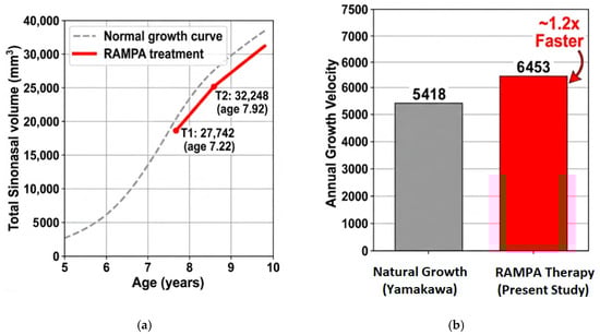 Background: The interrelationship between craniofacial morphology and respiratory function is a central focus of orthodontic and dentofacial orthopedic research. This study aimed to evaluate the volumetric changes in the sinonasal complex (combined nasal cavity and paranasal sinuses) following Right Angle Maxillary Protraction Appliance (RAMPA) therapy using cone-beam computed tomography (CBCT) and to compare these outcomes with established longitudinal growth benchmarks. Methods: A retrospective cohort analysis was conducted on 60 pediatric patients (24 males, 36 females; mean age: 86.60 ± 24.22 months) with radiologically clear paranasal sinuses at baseline (T1). Participants underwent RAMPA therapy for an average of 8.38 months. Volumetric quantification of the entire sinonasal complex—including the nasal cavity and all four paranasal sinuses (maxillary, ethmoid, sphenoid, and frontal)—was performed to ensure methodological alignment with existing normative growth data. Results: Total sinonasal volume increased significantly from 27,741.63 ± 10,675.85 mm3 at T1 to 32,248.00 ± 10,084.07 mm3 at T2 (p < 0.001), representing a mean gain of 4506.37 mm3 (16.24%). Notably, the annualized growth velocity under RAMPA therapy (6453 mm3/year) exceeded the physiological increment of age-matched normative data (~5418 mm3/year) by approximately 1.2 times. Despite a constricted baseline at T1 compared to normative values, the treatment group demonstrated a rapid “catch-up” growth trajectory. Conclusions: RAMPA therapy induces rapid and significant volumetric expansion of the sinonasal complex in pediatric patients, demonstrating a potent “acceleration effect” that surpasses natural physiological maturation. These findings suggest that orthopedic midfacial remodeling can effectively restructure the upper respiratory environment, bridging the gap between pathological constriction and normative developmental benchmarks in patients with maxillary hypoplasia.