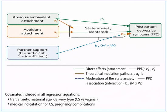 Background: Postpartum depression (PPD) is a clinically significant condition shaped by emotional regulation processes and close relational contexts. Anxiety is often theorized as a mediating mechanism linking relational vulnerabilities to depressive symptoms, yet empirical findings remain mixed. Objectives: This study examined whether state anxiety mediates the association between insecure attachment styles and PPD symptoms or whether its effects depend on relational context, specifically perceived partner support. Methods: In this cross-sectional study, a sample of 249 women assessed within 12 months postpartum completed self-report measures of attachment styles in the intimate relationship, state and trait anxiety, perceived partner support, and PPD symptoms. Hypotheses were tested using multiple regression analyses with heteroskedasticity-consistent standard errors, including mediation and moderation models. Results: Both anxious–ambivalent and avoidant attachment styles were associated with greater PPD symptom severity. State anxiety was neither an independent predictor nor a mediator of the attachment–PPD relationship. Instead, its association with PPD symptoms was conditional: anxiety was positively related to depressive symptoms only when perceived partner support was insufficient. Conclusions: Anxiety may function as a context-sensitive amplifier rather than a universal mechanism of postpartum depressive risk. These findings highlight the potential importance of relational context in understanding emotional vulnerability and depressive symptoms during the postpartum period.