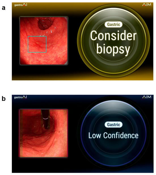 Background/Objectives: Artificial intelligence (AI)-assisted endoscopy has shown high sensitivity for early gastric cancer detection; however, false-positive diagnoses remain a clinical challenge. This study aimed to evaluate the real-world diagnostic performance of a commercially available AI system and to identify factors associated with false-positive diagnoses, focusing on repeated AI evaluations and confidence stratification. Methods: This single-center retrospective study included 47 patients with 89 localized gastric lesions evaluated between March 2024 and March 2025. Endoscopic examinations were performed under white-light, non-magnified observation with repeated AI assessments of each lesion. The rates of “Consider biopsy” (B) judgments were calculated. Lesions with a B judgment rate of ≥50% were defined as AI-positive and classified into four AI confidence categories. Diagnostic performance was assessed using sensitivity, specificity, positive predictive value (PPV), and negative predictive value (NPV). Factors associated with false-positive diagnoses were analyzed using penalized logistic regression. Results: The AI system demonstrated a sensitivity of 97.6% and an NPV of 95.7%, with a specificity of 45.8%. Pathology-positive rates decreased stepwise across the four AI confidence categories (p < 0.001). Among AI-positive lesions, low regional reproducibility, lesion size ≥ 30 mm, scar, and erosion were independently associated with false-positive diagnoses. In analyses restricted to non-neoplastic lesions, lesion size ≥ 30 mm remained significantly associated with false-positive diagnosis. Conclusions: In real-world clinical practice, a commercially available AI system provides high sensitivity for early gastric cancer detection. Incorporating confidence stratification and regional reproducibility into clinical decision-making may enhance the effective use of AI-assisted endoscopic diagnosis beyond binary interpretations.
