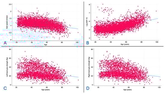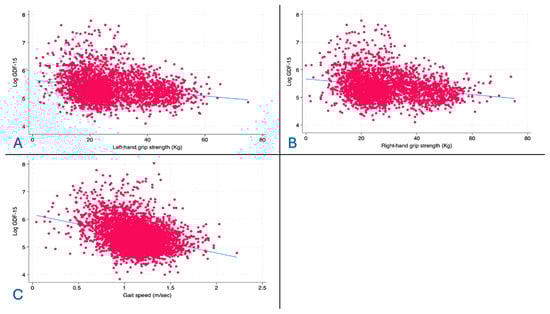 Background: Sarcopenia is the age-related, progressive loss of strength, function, and skeletal muscle mass, which can be assessed with specific tests. The Growth differentiation factor 15 (GDF-15) has been proposed as a key biomarker of aging, and it has been associated with mitochondrial dysfunction, cachexia, and physical impairment. Methods: The cohort of this study comes from the SardiNIA study, an ongoing longitudinal survey focused on the identification of genetic and phenotypic variants associated with aging. We assessed hand grip strength, gait speed, and GDF-15 in all samples. Linear multivariate analysis was used to assess the correlation after adjusting for a range of potential confounders. Results: The sample consisted of 4842 subjects (57.5% female) with a median age of 48.6 years. Levels of GDF-15 were comparable between males and females and showed a strong positive association with aging (rho 0.617, p < 0.001). Linear multivariate regression analyses showed that GDF-15 was negatively associated with gait speed and grip strength in both hands (respectively, Beta −0.09, Beta −0.07, and Beta −0.08, p < 0.001 for all). Conclusions: GDF-15 was negatively associated with physical function. GDF-15 may be considered a proxy for reduced physical performance. Future research is needed to understand the pathogenetic role of GDF-15 in the reduction in skeletal muscle in aging people.
