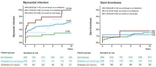 Background/Objectives: Long-term outcomes of patients with left main coronary artery (LMCA) disease and diabetes mellitus (DM) undergoing percutaneous coronary intervention (PCI) are incompletely investigated. The aim of this study was to assess the 10-year clinical outcomes after PCI according to diabetic status and antidiabetic therapy in patients with LMCA. Methods: This study represents a pooled analysis of two randomized trials (n = 1257 patients) on LMCA PCI focused on the prespecified subgroups of diabetic patients. Patients were categorized in groups according to the diabetic status and antidiabetic therapy (oral drugs or insulin therapy). The primary endpoint was 10-year all-cause mortality. Results: Overall, 361 patients had DM (246 patients on oral antidiabetic drugs and 115 patients on insulin therapy) and 896 patients had no DM. At 10 years, 477 patients died: 291 nondiabetic patients (35.7%), 111 diabetic patients (49.5%) on oral antidiabetic drugs and 75 diabetic patients (70.0%) on insulin therapy (hazard ratio [HR] = 1.57, 95% confidence interval [1.26–1.96]; p < 0.001 for diabetic patients on oral antidiabetic drugs vs. nondiabetic patients; HR = 2.80 [2.17–3.61]; p < 0.001 for diabetic patients on insulin therapy vs. nondiabetic patients; HR = 1.78 [1.33–2.39]; p <0.001 for diabetic patients on insulin therapy vs. diabetic patients on oral antidiabetic drugs). The 10-year incidence of myocardial infarction was higher in diabetic patients on insulin therapy (10.0%) versus diabetic patients on oral antidiabetic drugs (3.0%). There were no significant differences between the groups regarding the 10-year incidence of definite stent thrombosis, coronary artery bypass graft surgery, repeat PCI or stroke. Conclusions: In patients with LMCA disease undergoing PCI, DM was associated with a higher 10-year incidence of all-cause mortality than patients without DM with the worst outcomes observed in diabetic patients on insulin therapy.