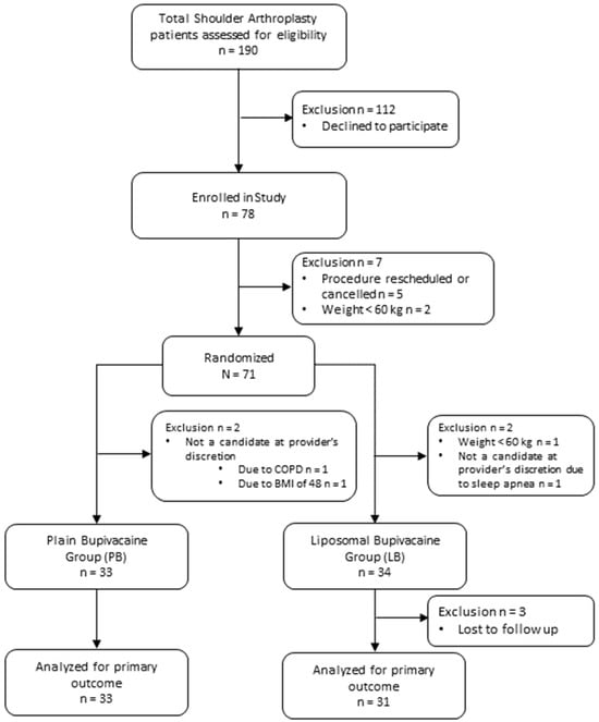 Background/Objectives: Interscalene brachial plexus block (ISB) is a common regional anesthesia technique for analgesia in patients undergoing shoulder surgery. Liposomal bupivacaine (LB) was developed to prolong analgesia duration; however, the existing literature demonstrates mixed results regarding its efficacy. This study aimed to compare the analgesic effectiveness of near-equipotent doses of LB and plain bupivacaine (PB) for patients undergoing total shoulder arthroplasty (TSA). Methods: This prospective double-blinded randomized controlled trial enrolled 78 elective TSA patients. Participants were randomized to receive an ISB with either 36 mL of 0.5% PB (180 mg) or a mixture of 10 mL of LB, 20 mL of 0.25% PB, and 6 mL of saline (183 mg). The primary outcome was the proportion of patients with clinically tolerable pain scores (visual analog scale (VAS) ≤ 4) on postoperative day (POD) 1 in each group. Secondary outcomes included the proportion of patients with clinically tolerable pain scores on POD 2–5, overall pain scores in the post-anesthesia care unit (PACU) and on POD 1–5, Quality of Recovery Survey-15 (QoR-15) scores on POD 1–5, analgesic consumption on the day of surgery and on POD 1–5, and adverse events. Results: A total of 67 patients completed the study. There was a statistically significant increase in median body mass index (BMI) in the PB vs. LB group (30.0 (27.4–33.1) vs. 27.0 (24.3–29.4), p = 0.0197). All other demographic characteristics were comparable between groups. There was no difference in the primary outcome or any of the secondary outcomes. Conclusions: LB did not reduce postoperative pain compared to PB. Larger, multicenter studies are warranted to further evaluate the clinical benefit of LB in this population.