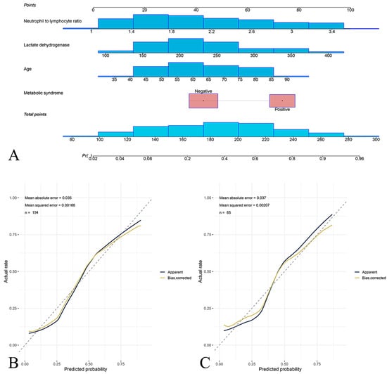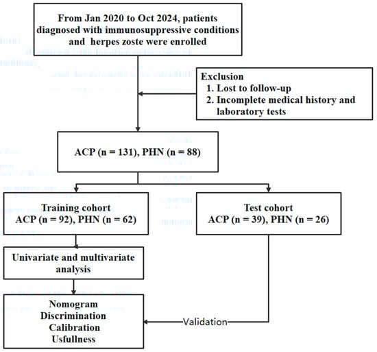 Background/Objectives: Herpes zoster is caused by varicella-zoster virus reactivation, which often leads to a chronic pain condition named postherpetic neuralgia (PHN). Patients with immunosuppressive conditions face a heightened risk of developing PHN. This study aims to identify factors contributing to PHN development in immunosuppressive patients. Methods: This retrospective cohort study was conducted involving 219 immunosuppressive patients from two centers and split into training and test cohorts. Participants were divided into PHN (n = 88) and acute phase pain (ACP, n = 131) groups. Univariate and multivariate logistic regression analyses were used to identify clinical predictors of PHN. A nomogram was constructed to predict PHN risk by integrating significant predictors. The discrimination, calibration and clinical usefulness of the nomogram were evaluated. Results: Multivariate analysis revealed metabolic syndrome, older age, higher lactate dehydrogenase (LDH), and higher neutrophil-to-lymphocyte ratio (NLR) as significant PHN predictors. The nomogram showed good discrimination in both training (AUC of 0.83 [95% CI 0.77–0.90] with a specificity of 0.78, sensitivity of 0.87, NPV of 0.90, and PPV of 0.73) and test cohorts (AUC of 0.85 [95% CI 0.75–0.96] with a specificity of 0.82, sensitivity of 0.85, NPV of 0.89, and PPV of 0.76). Clinical decision curve analysis confirmed the practical utility of the nomogram. Conclusions: The nomogram incorporating age, metabolic syndrome, LDH, and NLR are useful in estimating PHN risk among immunosuppressed patients.