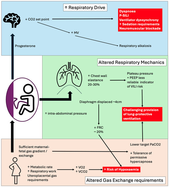 Background/Objectives: Respiratory failure in late pregnancy represents a complex and high-risk clinical scenario due to physiological adaptations during pregnancy that reduce maternal respiratory reserve, with tightly coupled maternal and foetal outcomes. This review aims to synthesise current evidence on epidemiology, maternal–foetal physiology, and