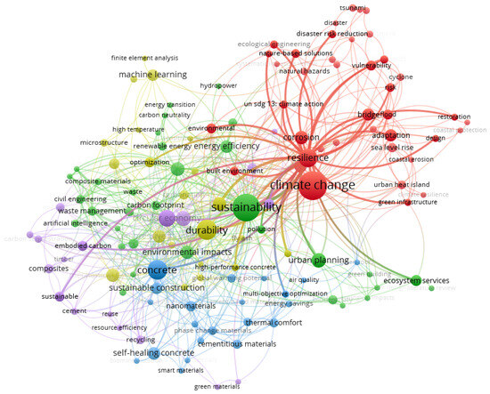 Panama, with nearly 3000 km of coastline and half its population living in coastal zones, faces high vulnerability to sea level rise, flooding, and extreme events. The most vulnerable areas include low-lying coastal provinces such as Panama, Colón, and Chiriquí. This review explores the use of sustainable concrete to address the effects of climate change in Panama towards coastal resilience. The methodology combined a bibliometric analysis using VOSviewer, a systematic literature review (2015–2025) of 99 sources including regulations and technical standards, and a socioeconomic SWOT analysis to assess adoption drivers and barriers. A 2050 permanent inundation map was examined to identify vulnerable areas, and an inventory of concrete-based protection structures was developed. The results highlight that concrete is already used in Panama for coastal resilience through structures such as breakwaters, dolos, and Xbloc units. However, as the country still needs to expand its coastal protection infrastructure, there is a crucial opportunity to implement lower-impact, sustainable concrete alternatives that minimize environmental burdens while ensuring long-term durability and performance. Sustainable options, including supplementary cementitious materials (SCMs), recycled aggregates, and CO2 injection technologies, demonstrate strong mitigation potential, with national initiatives such as Vertua, Greentec, and Argos pozzolan offering early pathways. The conclusions emphasize the need to expand sustainable concrete applications, integrate nature-based solutions, and strengthen Panama’s regulatory and technical capacity to achieve resilient, low-carbon coastal infrastructure.