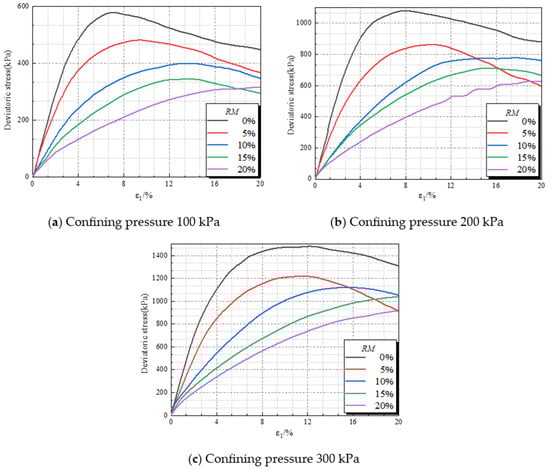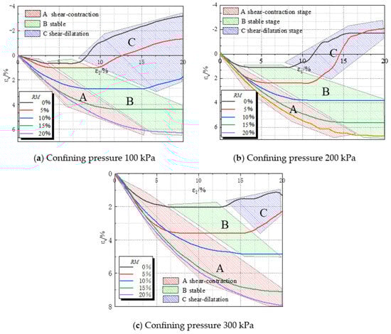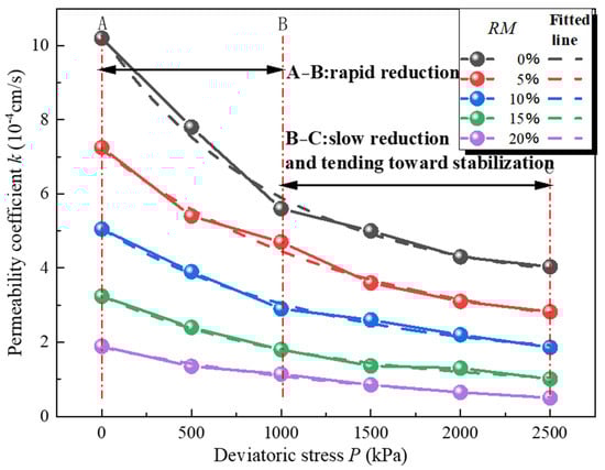 The application of rubber in geotechnical engineering has gained widespread popularity due to its potential to enhance the engineering properties of foundation fills while reducing environmental pollution. This study focuses on investigating the influence of the rubber fiber content on the performance of calcareous sand by conducting a series of triaxial tests. The effects of the rubber fiber content and axial pressure on the strength, deformation, permeability, and particle breakage of rubber–calcareous sand were systematically studied. The experimental results reveal that increasing the rubber fiber content reduces the strength of rubber–calcareous sand, but it also inhibits the shear dilation and mitigates the occurrence of rupture surfaces: the sample with a rubber content of more than 10% only has shear-contraction. Both the rubber fiber content and axial stress contribute to the increased impermeability of rubber-modified calcareous sand, although they exhibit different characteristics. The relationship between the rubber fiber content and permeability coefficient is linear, while, under increasing axial stress, the permeability coefficient initially decreases rapidly; when the deviatoric stresses exceeds 1000 kPa, the decreasing rate slows down. Furthermore, rubber fiber significantly reduces particle breakage in calcareous sand. The relationship between the input energy applied to rubber-modified calcareous sand and the relative breakage rate of calcareous sand can be well-fitted with a power function. Samples with a higher rubber fiber content exhibit a lower relative breakage rate of calcareous sand under the same absorbed input energy. Through the research results of this paper, the best rubber ratio can be selected as the road filler in engineering practice to ensure both cost-effectiveness and environmental protection.