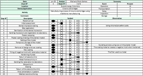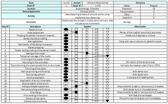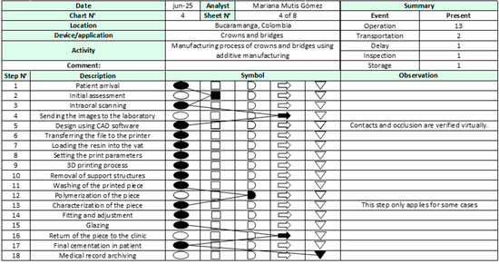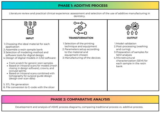 Additive manufacturing (AM) is rapidly transforming clinical workflows in dentistry by enabling the customized, efficient, and digitally integrated production of dental devices. However, the existing literature lacks a process-oriented perspective on its technical and operational impact. This study aims to address this gap through a dual-phase analysis using the Input–Transformation–Output (ITO) framework, providing practical insights into the operational reconfiguration enabled by AM. The first phase examined materials, image acquisition methods, design and lamination software, printing technologies, and key parameters across each stage of the AM workflow. The second phase analyzed four clinical applications (dental models, crowns and bridges, occlusal splints, and surgical guides) supported by a structured fabrication protocol and scanning electron microscopy (SEM) of 18 resin samples to assess surface quality and process-related defects. In addition, for each application, a comparative process analysis with traditional workflows was conducted using ASME diagramming. The findings indicate that AM reduces cycle times, manual intervention, and supply chain reliance while enabling production models such as Make-to-Order (MTO) and Engineer-to-Order (ETO). Its integration also fosters decentralized, in-clinic manufacturing with enhanced autonomy, flexibility, and reduced lead times. Nonetheless, this study highlights persisting challenges, including post-processing quality control, training requirements, and cost-efficiency concerns in low-volume settings. A hybrid model combining AM with conventional methods emerges as a pragmatic strategy for clinical adoption.