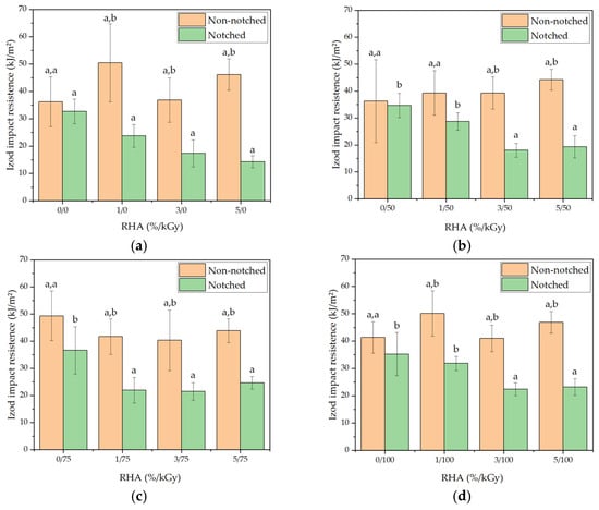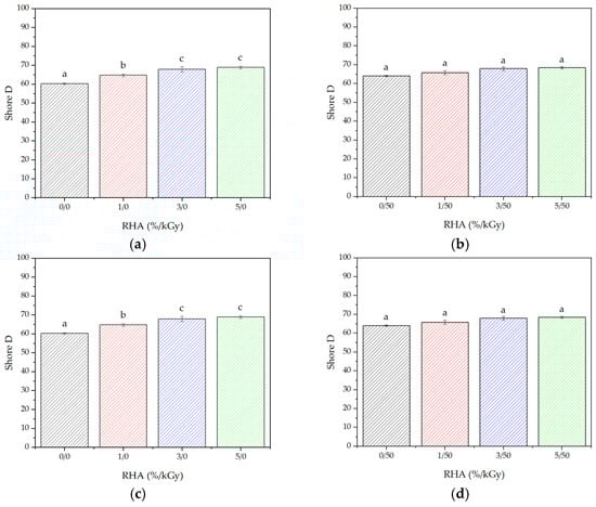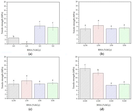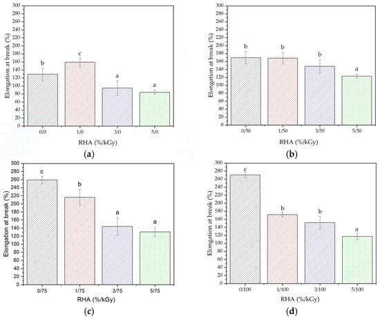 High-density polyethylene (HDPE) is a valuable material, but its application under certain operational conditions is limited by oxidation resistance. To mitigate this, rice husk ash (RHA), a silica-rich (~95%) byproduct, was incorporated as a reinforcing filler. This study evaluates the effect of electron beam (EB) irradiation, at doses up to 100 kGy, on the properties of HDPE/RHA composites, focusing on mechanical performance and the polymer–filler interface. The results demonstrate that EB irradiation induces crosslinking and enhances interfacial interaction between the HDPE matrix and RHA filler. While the overall tensile strength of neat HDPE tended to decrease with irradiation dose (from 28.5 ± 1.2 MPa to 24.1 ± 1.5 MPa at 100 kGy), the optimization of dose and filler contents produced notable results: A maximum tensile strength of 29.0 ± 1.1 MPa was achieved in the composite containing 5 wt% RHA at 75 kGy. Furthermore, irradiation stabilized the material’s behavior, resolving the heterogeneous dispersion observed in non-irradiated samples with low RHA content. Regarding toughness, Izod’s impact resistance increased from 3.2 ± 0.2 kJ/m2 to 3.7 ± 0.3 kJ/m2 for the 10 wt% RHA composites irradiated at 50 kGy. Statistical analysis (ANOVA, p < 0.05) confirmed the significance of these changes. In conclusion, electron beam irradiation is an effective tool for optimizing the mechanical properties and performance uniformity of HDPE/RHA composites, making them promising candidates for applications requiring enhanced durability and consistency, such as food packaging.