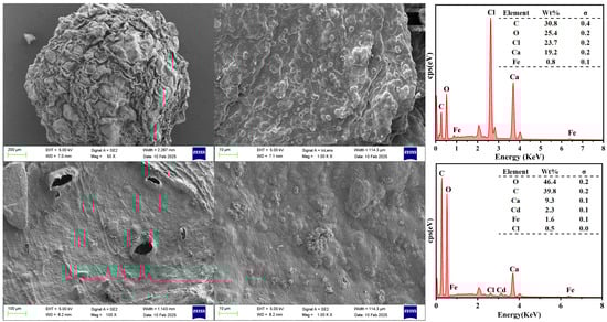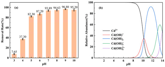 Using Microcystis aeruginosa as the raw material, the microalgae was modified through a potassium permanganate–ferrous sulfate treatment process to prepare Fe-Mn oxide-modified algal powder. Sodium alginate was then combined with this modified powder to create Fe-Mn-modified algal powder gel beads, which were employed for the adsorption of Cd(II) from water. At pH = 9, with dosage of 6 g·L−1 and a contact time of 8 h, the Cd(II) solution at an initial level of 1.0 mg·L−1 achieved a removal efficiency of 96%, and the maximum adsorption capacity is 15.06 mg·g−1. The adsorption behavior conformed to the Langmuir isotherm and obeyed the pseudo-second-order kinetics, and was primarily governed by chemical adsorption. This involved complexation with hydroxyl (-OH) and carboxyl (-COO−) functional groups, the ion exchange of Ca2+ with Cd(II), and surface complexation on Fe-Mn oxides. This study provides a valuable basis for the resource utilization of algae and the remediation of Cd contamination.