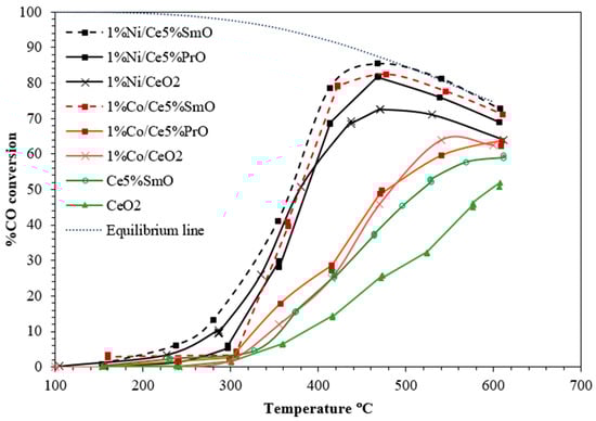 The activity of Co- and Ni-containing ceria-based catalysts for water–gas shift (WGS) reaction were examined in this work. The catalysts were prepared by the urea co-precipitation method. Sm and Pr dopant (5 wt.%) was used as a structural stabilizer of CeO2,