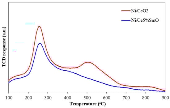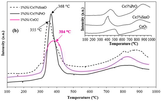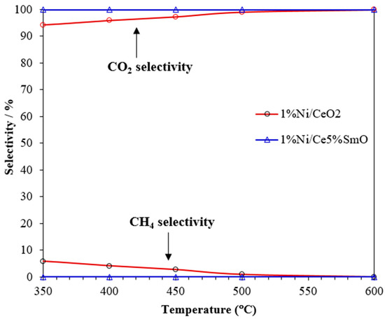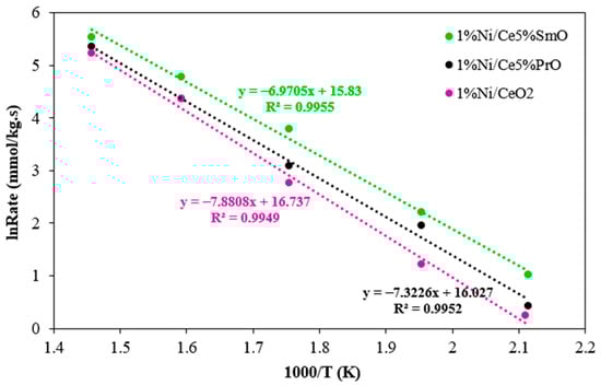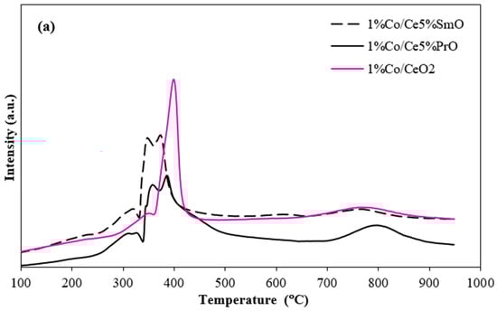 The activity of Co- and Ni-containing ceria-based catalysts for water–gas shift (WGS) reaction were examined in this work. The catalysts were prepared by the urea co-precipitation method. Sm and Pr dopant (5 wt.%) was used as a structural stabilizer of CeO2, while Co or Ni was used in a small amount (1 wt.%). H2-TPR experiments indicate that both Sm and Pr addition increased the reducibility of CeO2. Among the studies’ catalysts, 1%Ni/Ce5%SmO exhibited the highest WGS activity. In addition, WGS rate was measured in the temperature range of 200–400 °C for Ni supported on CeO2, Ce5%SmO, and Ce5%PrO. The activation energy of the reaction over 1%Ni/Ce5%SmO was 57 kJ/mol, while it was 61 and 66 kJ/mol, respectively, over 1%Ni/Ce5%PrO and 1%Ni/CeO2 catalysts. A WGS reaction mechanism, CO adsorbed on the metal cluster is oxidized by oxygen supplied from the CeO2 support at the metal–ceria interface. This oxygen is then re-oxidized by H2O, which caps the oxygen vacancy on the ceria surface, and thereby oxygen vacancies serve as active sites for the WGS reaction. Raman experiments indicate that the presence of Sm in 1%Ni/Ce5%SmO catalyst promoted the formation of oxygen vacancies, leading to enhanced WGS performance.