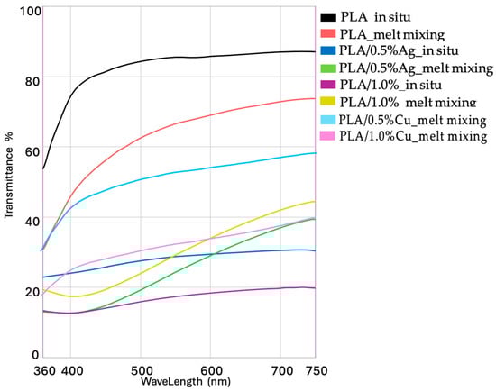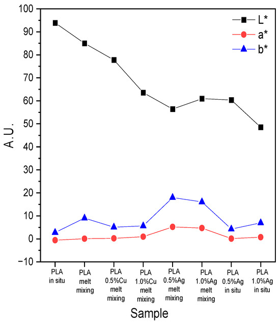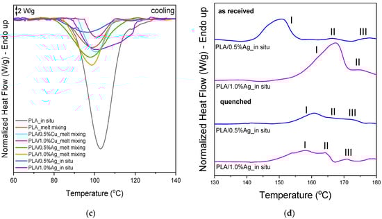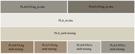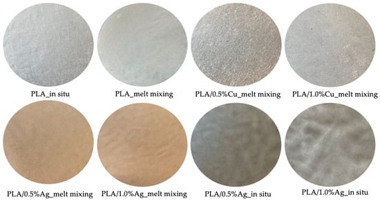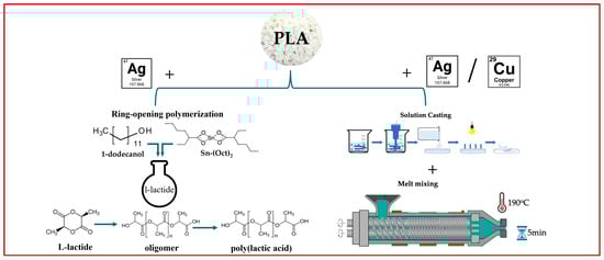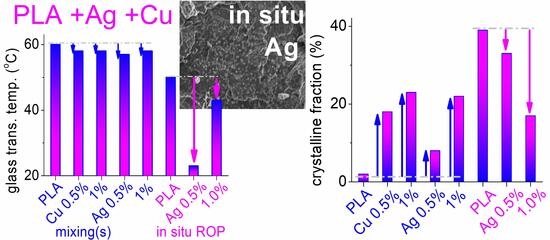 A comprehensive investigation was conducted focusing on two series of poly(lactic acid) (PLA)-based nanocomposites filled with small amounts (0.5 and 1.0%) of metal (Ag/Cu) nanoparticles (NPs). Our work aimed to synthesize PLA/Ag nanocomposites via in situ ring-opening polymerization (ROP), and for comparison purposes,