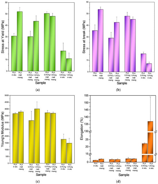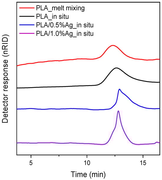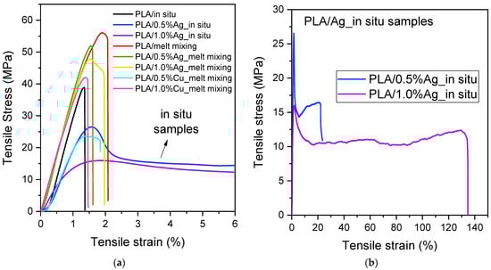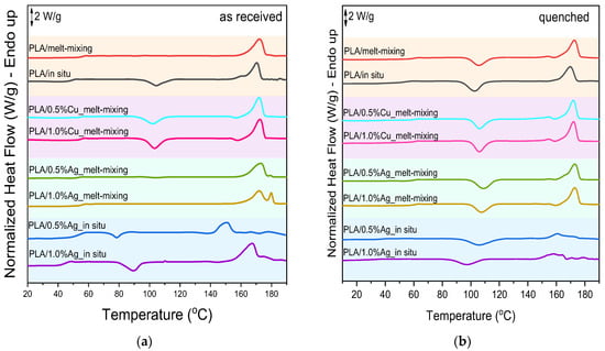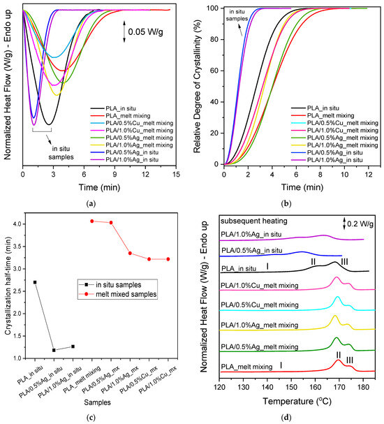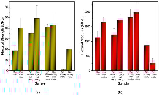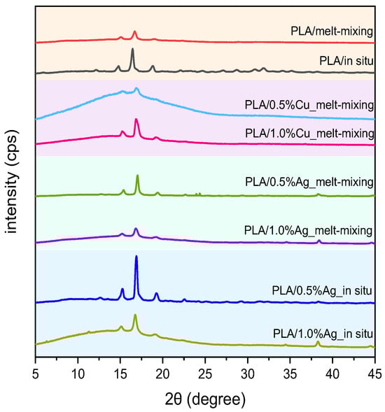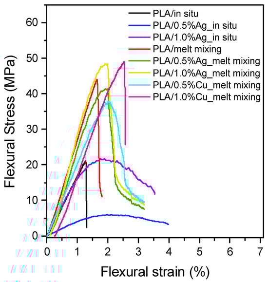 A comprehensive investigation was conducted focusing on two series of poly(lactic acid) (PLA)-based nanocomposites filled with small amounts (0.5 and 1.0%) of metal (Ag/Cu) nanoparticles (NPs). Our work aimed to synthesize PLA/Ag nanocomposites via in situ ring-opening polymerization (ROP), and for comparison purposes, the same materials were also prepared via solution casting followed by melt mixing. PLA/Cu nanocomposites were also prepared via melt extrusion. Gel permeation chromatography (GPC) and intrinsic viscosity measurements [η] showed that the incorporation of Ag nanoparticles (AgNPs) resulted in a decrease in the molecular weight of the PLA matrix, indicating a direct effect of the AgNPs on its macromolecular structure. Fourier-transform infrared spectroscopy (FTIR) revealed no significant changes in the characteristic peaks of the nanocomposites, except for an in situ sample containing 1.0 wt% of AgNPs, where slight interactions in the C=O region were detected. Differential scanning calorimetry (DSC) analysis confirmed the semi-crystalline nature of the materials. Glass transition temperature was strongly affected by the presence of NPs in the case of the in situ-based samples. Melt crystallized studies suggested potential indirect polymer–NP interactions, while isothermal melt crystallization experiments confirmed the nucleation ability of the NPs. The mechanical performance was assessed via tensile and flexural measurements, revealing that the in situ-based samples exhibited remarkable flexibility. Moreover, during the three-point bending tests, none of the in situ nanocomposite samples broke. In this context, next-generation PLA-based nanocomposites have been proposed for advanced applications, including flexible printed electronics.