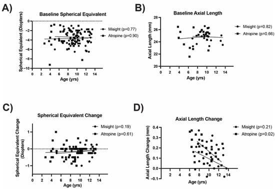Objective: The purpose of this study is to investigate the effect of low-dose atropine and dual-focus MiSight contact lenses on myopia control. Methods: This study included a retrospective review of patients (5–13 years old) started on MiSight contacts or 0.05% atropine with a ≥1-year follow-up. Outcomes included cycloplegic refraction, axial length measurement, and side effects. The right eyes were included in analyses. Results: One hundred children were treated with MiSight lenses (n = 55) or 0.05% atropine (n = 45) at an average age of 10.4 ± 2.1 years and 8.4 ± 2.5 years, respectively. At the 1-year follow-up, there was no difference from baseline in spherical equivalent or axial length in the MiSight group (p = 0.61, p = 0.98) or in the atropine group (p = 0.78, p = 0.97). Further, subgroup analysis based on age at treatment initiation (<9.5 years vs. ≥9.5 years) showed no age difference in baseline or final spherical equivalent and axial length in either the MiSight group or the atropine group. Linear regression analysis demonstrated no association between initial age and baseline spherical equivalent, baseline axial length, or the change in spherical equivalent in either the MiSight or atropine group. Conclusions: There was no significant difference in spherical equivalent or axial length after 1 year of treatment with either the MiSight contact lenses or 0.05% atropine eye drops. However, the limited sample size, the difference in age and ethnicity, and baseline refraction prevent a direct comparison between the two treatment groups.