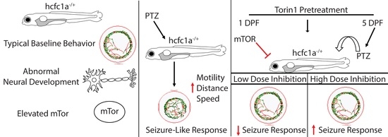 Mutations in the transcriptional co-factor HCFC1 cause methylmalonic aciduria and homocystinemia, cblX type (cblX) (MIM#309541), non-syndromic X-linked intellectual disability (XLID), and focal epilepsy. Zebrafish studies have revealed increased activation of the Akt/mTor signaling pathway after mutation of hcfc1a, one ortholog of HCFC1. mTOR hyperactivation is linked to seizures, and its inhibition alleviates epilepsy in other preclinical models. We hypothesized that mTor overactivity in hcfc1a mutant zebrafish increases seizure susceptibility and/or severity. We employed a two-concentration model of the seizure-inducing agent, pentylenetetrazol (PTZ), with or without pretreatment of the mTor inhibitor, torin1. Mutation of hcfc1a did not alter the response to PTZ at sub-optimal concentrations, and the pharmaceutical inhibition of mTor using the compound Torin1 reduced response to 1 µM PTZ, but only in a dose-dependent manner. Higher doses of mTor inhibition did not reduce the seizure response in mutant larvae but were effective in wildtype siblings. These data suggest that inhibition of mTor in an hcfc1a-deficient background leads to a reaction that differs from the traditional response observed in wildtype siblings. Collectively, we present a model that can be used to test dose–response and the development of combinatorial treatment approaches in a high-throughput manner.