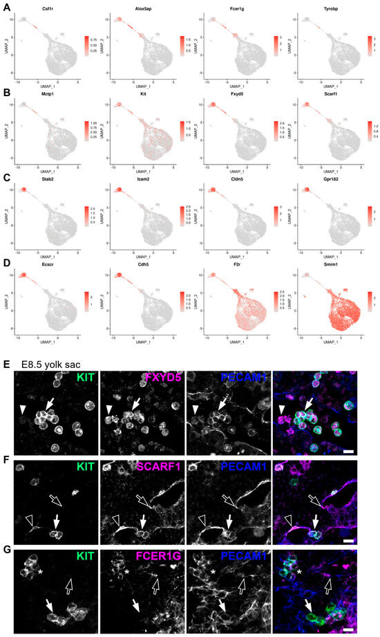 Erythro-myeloid progenitors (EMPs) originate from the haemogenic endothelium in the yolk sac via an endothelial-to-haematopoietic transition (EHT) to generate blood and immune cells that support embryo development. Yet, the transitory nature of EHT and the limited availability of molecular markers have constrained our understanding of the origin, identity, and differentiation dynamics of EMPs. Here, we have refined the annotation of yolk sac haemato-vascular populations in publicly available single-cell RNA sequencing (scRNAseq) datasets from mouse embryos to identify novel molecular markers of haemogenic endothelium and EMPs. By sub-clustering key cell populations followed by pseudotime analysis, we refined cluster annotations and then reconstructed differentiation trajectories. Subsequent differential gene expression analysis between clusters identified novel cell surface markers for haemogenic endothelial cells (Fxyd5 and Scarf1) and EMPs (Fcer1g, Tyrobp, and Mctp1). Further, we have identified candidate signalling and metabolic pathways that may regulate yolk sac haematopoietic emergence and differentiation. The specificity of FXYD5, SCARF1, and FCER1G for haemogenic endothelium and EMPs was validated by immunostaining of the mouse yolk sac. These insights into the transcriptional dynamics in the yolk sac should support future investigation of EHT and haematopoietic differentiation during early mammalian development.