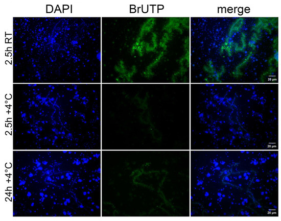 Lampbrush chromosomes (LBCs) are a feature of amphibian oocytes and are typically associated with high levels of transcription during active oocyte growth. However, their state during winter hibernation has not been studied. Here, we investigated LBCs in early vitellogenic oocytes (early stage 4) of the grass frog Rana temporaria during winter hibernation. We found that the chromosomes retained their lampbrush morphology, and the phosphorylated form of RNA polymerase II resided on the lateral loops. Transcription on the lateral loops was reduced but detectable at cold conditions and significantly increased when the oocytes were transferred at room temperature. Satellite S1a transcripts were detected at the lateral loops of the chromosomes by RNA FISH. The possible significance of maintaining chromosomes in the lampbrush form during hibernation is discussed.