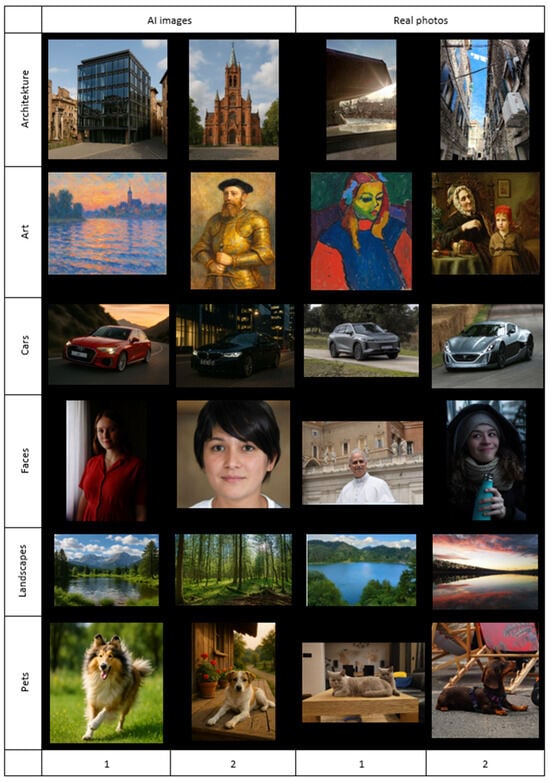 Recently, the photorealism of generated images has improved noticeably due to the development of AI algorithms. These are high-resolution images of human faces and bodies, cats and dogs, vehicles, and other categories of objects that the untrained eye cannot distinguish from authentic photographs. The study assessed how people perceive 12 pictures generated by AI vs. 12 real photographs. Six main categories of stimuli were selected: architecture, art, faces, cars, landscapes, and pets. The visual perception of selected images was studied by means of eye tracking and gaze patterns as well as time characteristics, compared with consideration to the respondent groups’ gender and knowledge of AI graphics. After the experiment, the study participants analysed the pictures again in order to describe the reasons for their choice. The results show that AI images of pets and real photographs of architecture were the easiest to identify. The largest differences in visual perception are between men and women as well as between those experienced in digital graphics (including AI images) and the rest. Based on the analysis, several recommendations are suggested for AI developers and end-users.